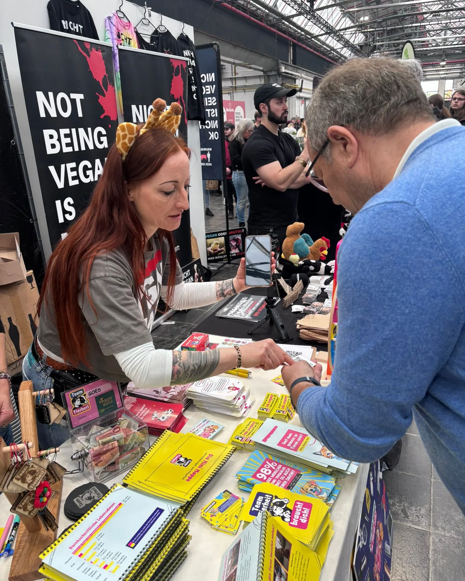 Ein zentraler Bestandteil unseres Messestandes war zudem die Liveübertragung des NEON Protests aus Berlin, der Einblicke in den Ablauf unserer Proteste gab. Währenddessen sind Gespräche entstanden, die über das hinausgingen, was man auf einer Messe erwarten würde. Menschen haben ihre Haltung hinterfragt, einige haben sie auf der Stelle verändert. Manche standen noch am Anfang ihres veganen Lebens, andere haben den nächsten Schritt in Richtung Aktivismus gemacht. Jede Person wurde von uns individuell angesprochen, aufgeklärt und begleitet, orientiert an ihrer jeweiligen Situation. Und natürlich hatten wir immer das passende Aufklärungsmaterial zur Hand, was wir den Leuten mitgeben konnten.